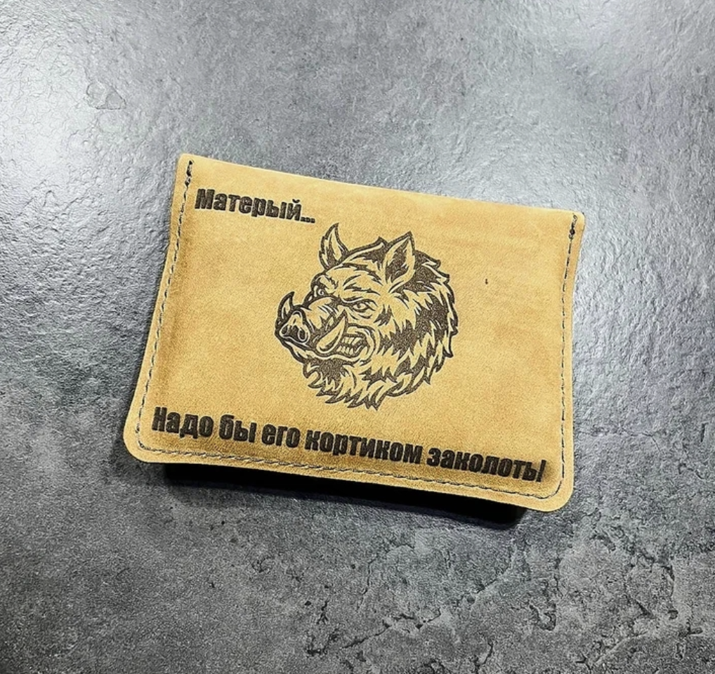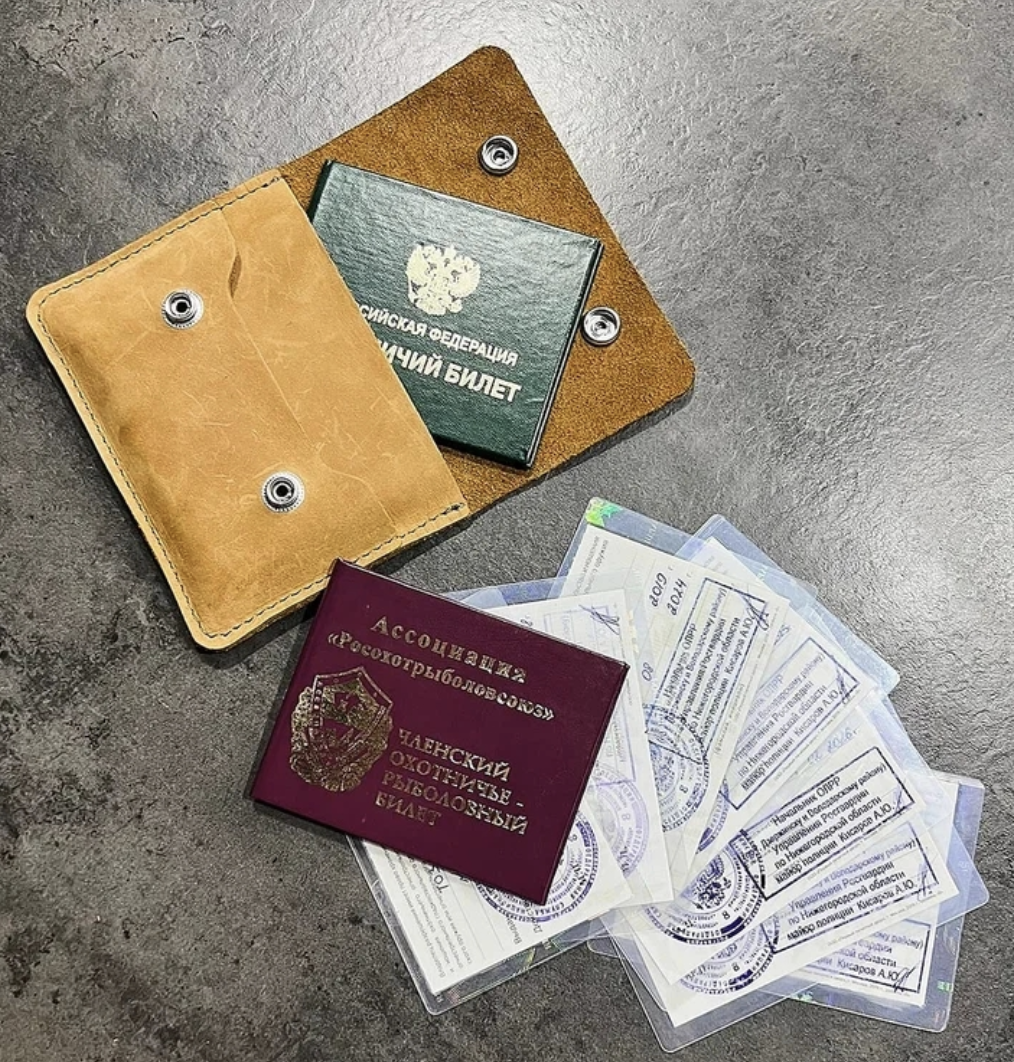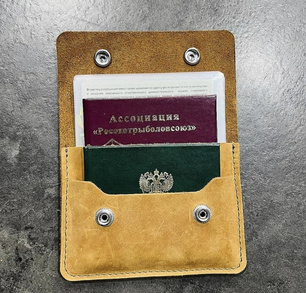 Вместительный чехол на охотничьи документы из натуральной плотной очень приятной на ощуп кожи. Два вместительных кармашка и клапан на заклепках. Гравировка с отсылкой из к/ф "ДМБ".