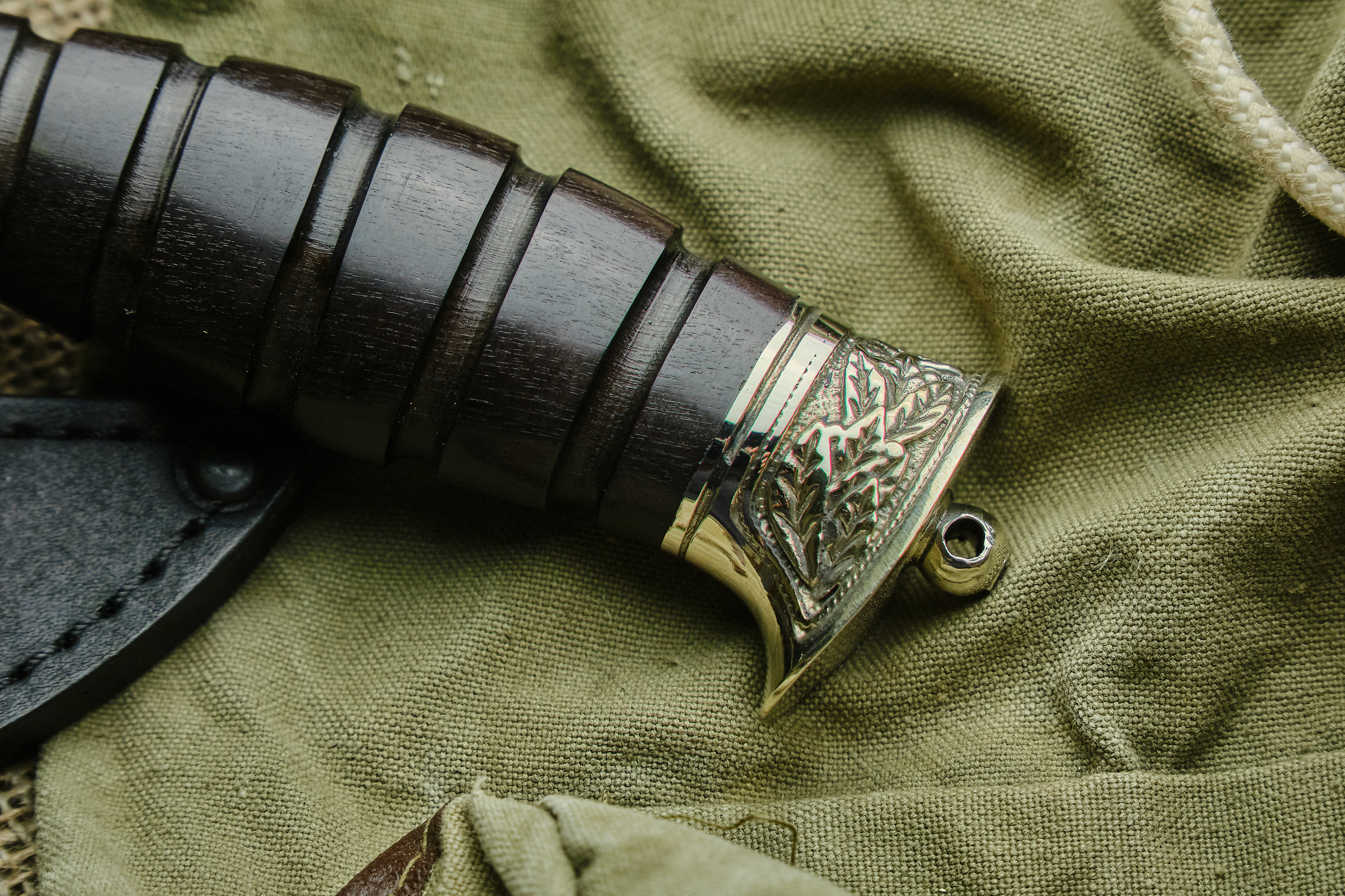 - Форма: по историческим фото без выраженной гарды, резьбой на рукояти для надежного хвата.
